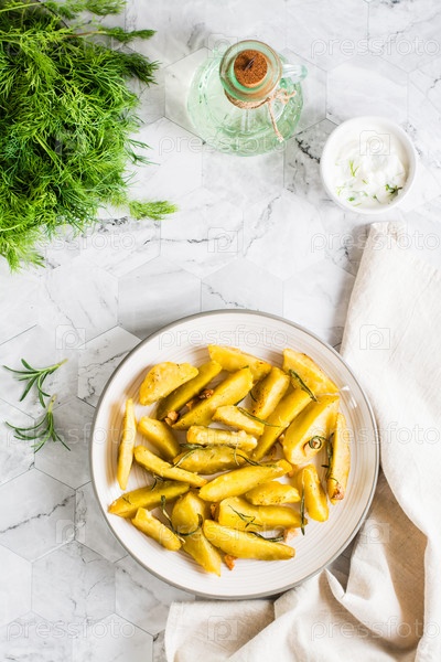 Запеченные картофельные дольки с чесноком и розмарином на тарелке на столе. Верхний и вертикальный вид