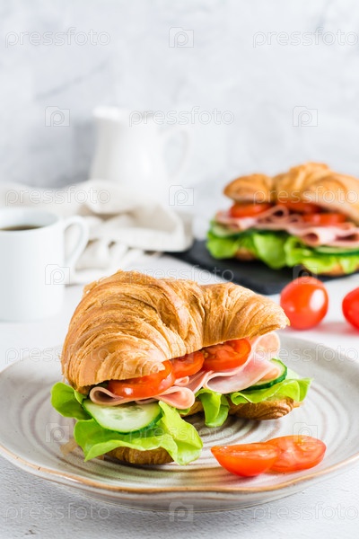 Сэндвич со свежим круассаном с ветчиной, овощами и салатом на тарелке. Вертикальный вид