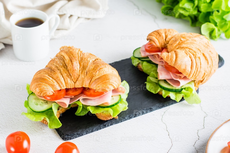 Бутерброды с круассаном с ветчиной, салатом и овощами на доске на столе. Домашний фаст-фуд