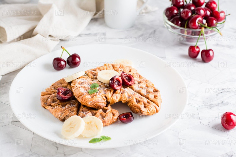 Аппетитные крофлы с вишней и бананами на тарелке на столе. Уличная забегаловка