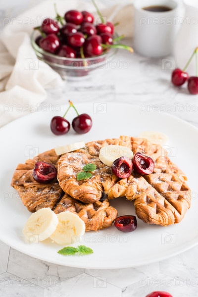 Аппетитные крофлы с вишней и бананами на тарелке. Уличная забегаловка. Вертикальный вид. Крупный план