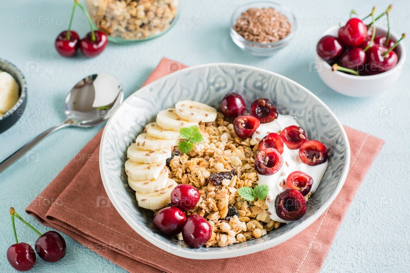 Гранола с вишней, бананом и семенами льна в миске на столе. Домашний завтрак. Крупный план