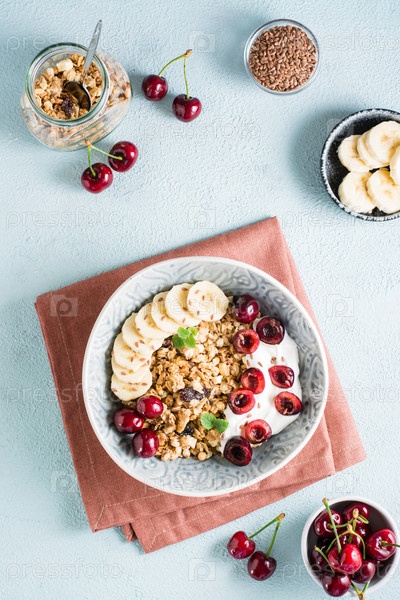 Гранола с вишней, бананом и семенами льна в миске. Домашний завтрак. Вид сверху и вертикальный