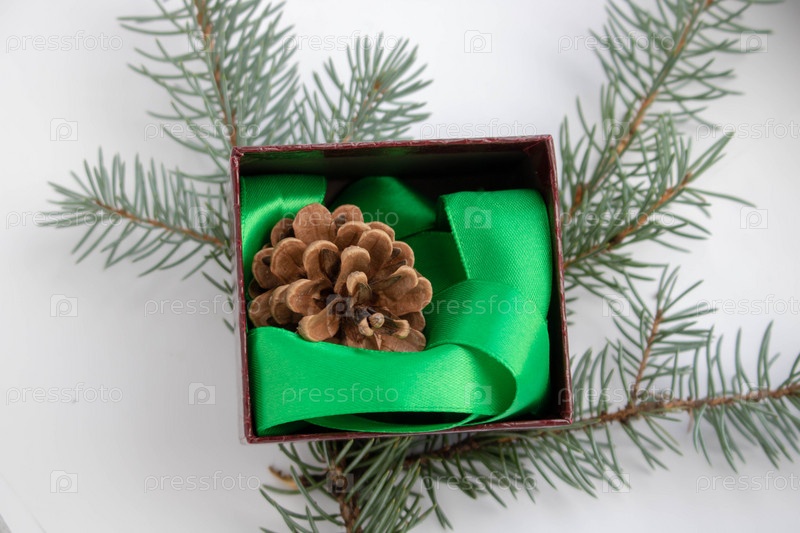 Рождественская и новогодняя композиция. Подарочная коробка с лентой и еловыми ветками с шишками на белом фоне. Плоская планировка