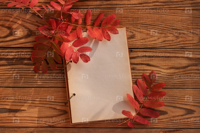 Осенняя композиция с блокнотом и рябиной на деревянных досках. Список дел на осень. Составьте список дел на осень или список покупок. Список желаний, плейлист. Место для текста