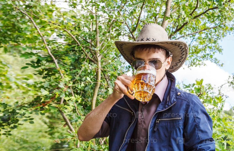 Молодой человек пьет пиво в парке