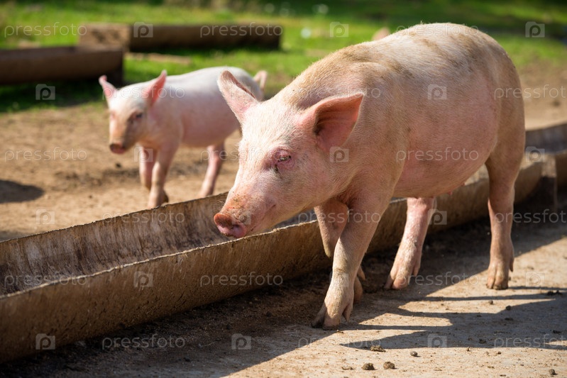 Маленькие поросята возле кормушки на животноводческой ферме в летний день