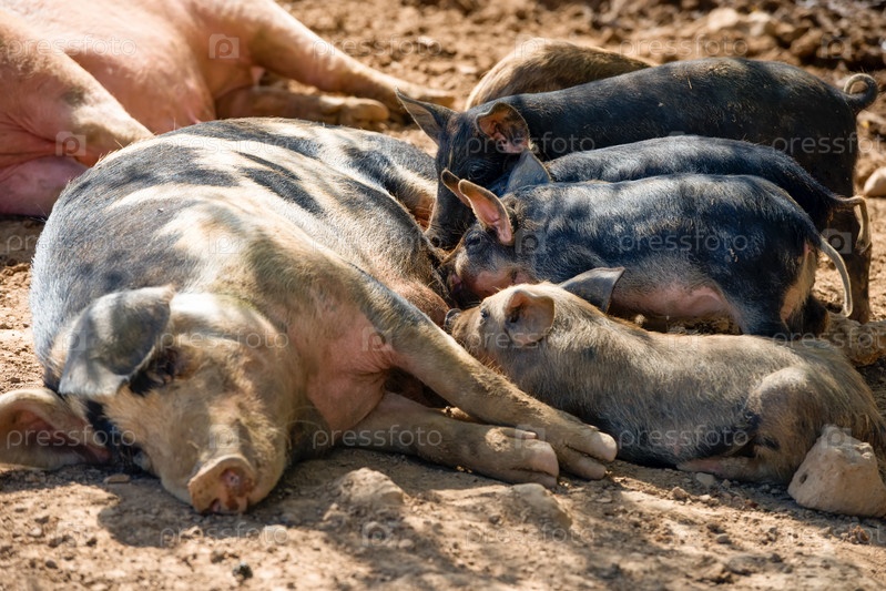 Мать-свинья со своими маленькими поросятами в загоне на ферме