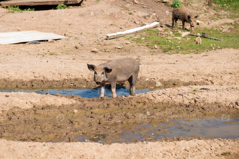 Свинья стоит в луже в летний день на ферме