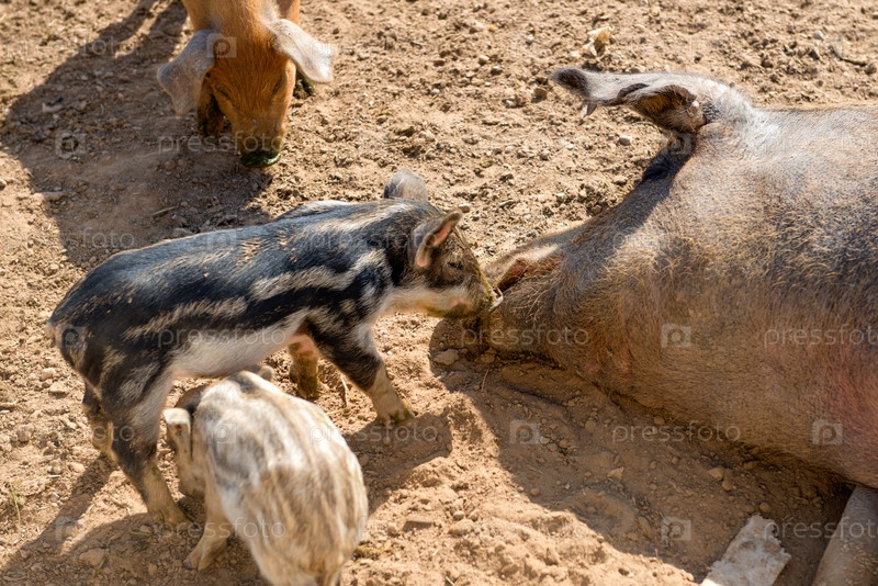 Мать-свинья со своими маленькими поросятами в загоне на ферме