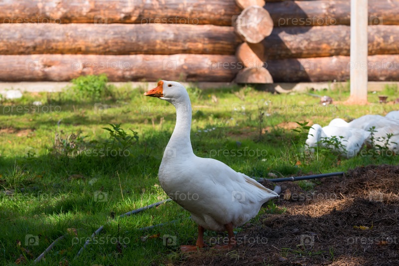 Белые гуси гуляют по территории животноводческой фермы в летний день
