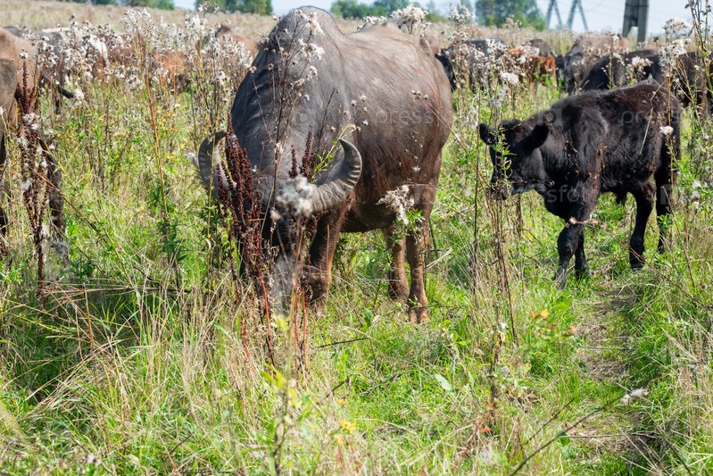 Буйвол ест траву на пастбище в летний день