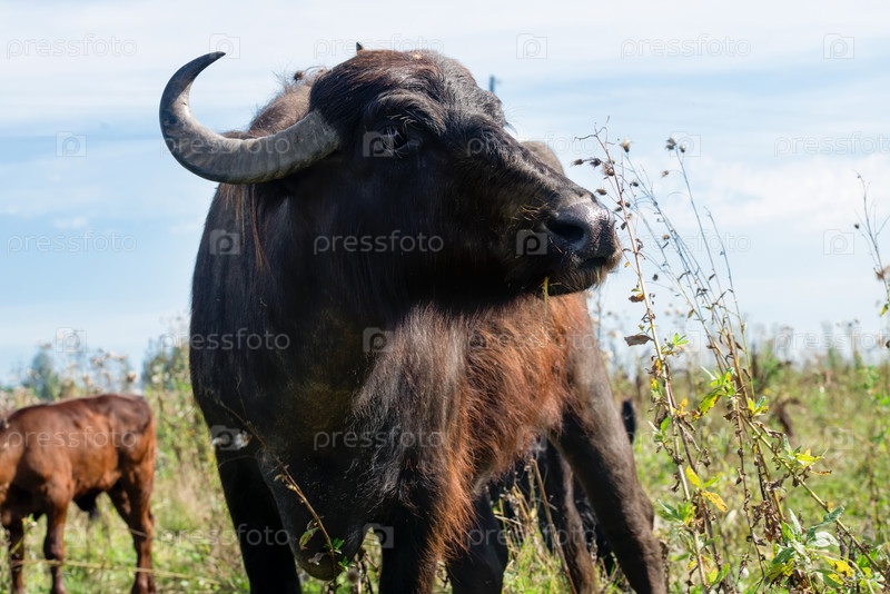 Буйвол ест траву на пастбище в летний день
