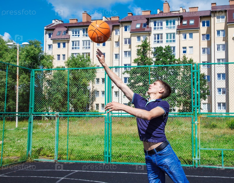 Молодой человек играет в баскетбол на открытом воздухе