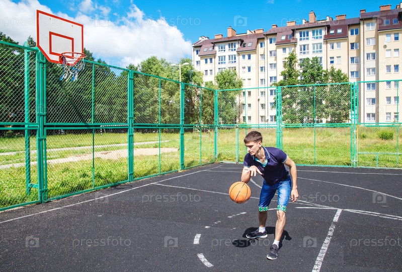 Молодой человек играет в баскетбол на открытом воздухе