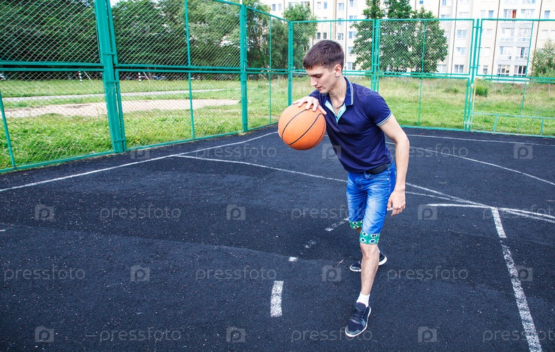 Молодой человек играет в баскетбол на открытом воздухе