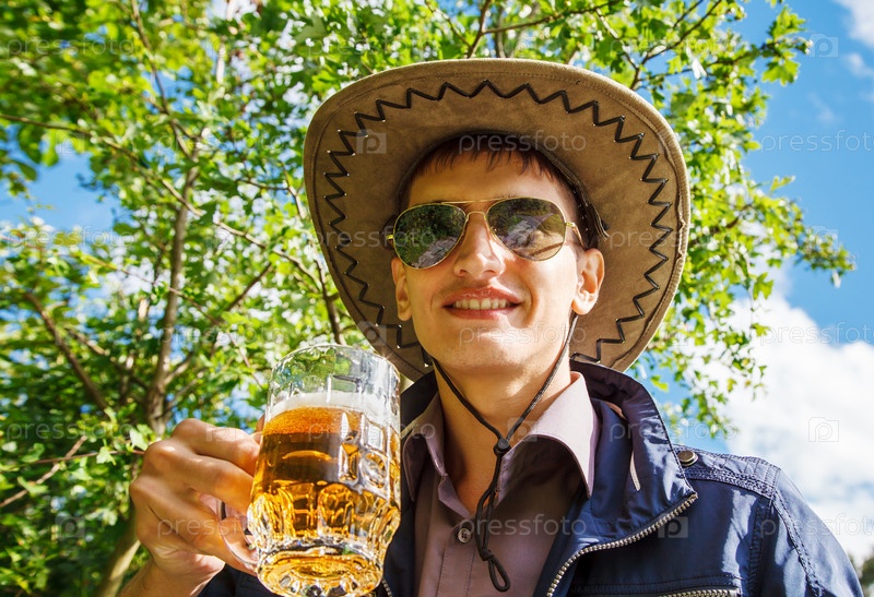 Молодой человек пьет пиво в парке