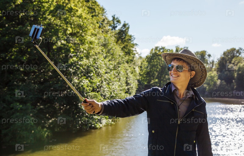 Молодой человек делает селфи с палкой для селфи