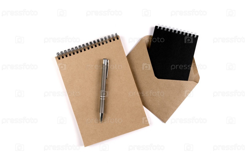 Пустые спиральные блокноты и переработанный конверт, сложенные на белом фоне рядом с автоматической ручкой. Образование, офис, охрана окружающей среды, ноль отходов