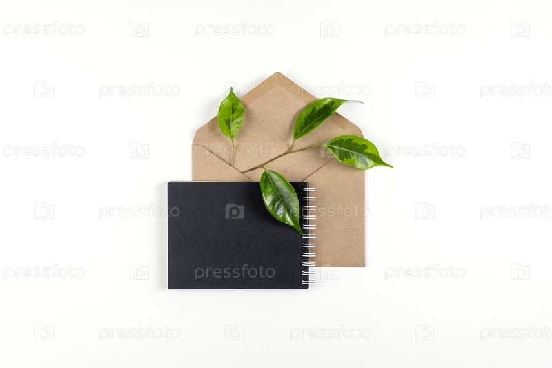 Черный блокнот и конверт из переработанной бумаги лежат на белой поверхности