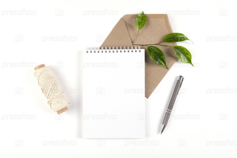 Блокнот, конверт из переработанной бумаги и катушка с простыми грубыми нитками