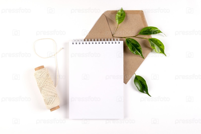 Блокнот, конверт из переработанной бумаги и катушка с простыми грубыми нитками