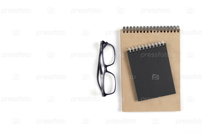 Два блокнота и очки лежат на белой поверхности