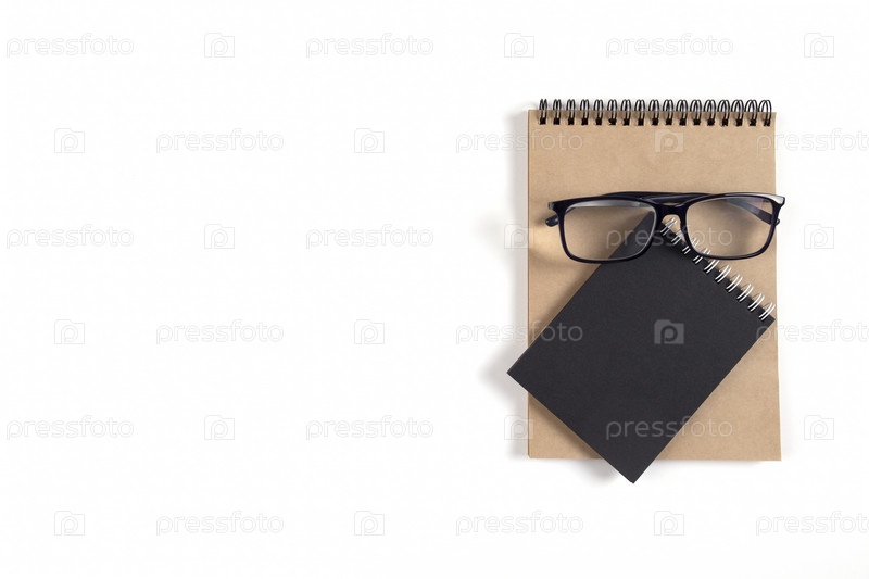Два блокнота и очки лежат на белой поверхности