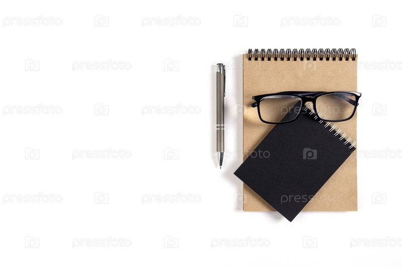 Два блокнота, ручка и очки лежат на белой поверхности