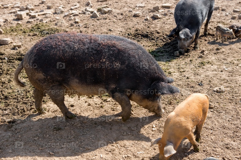 Мать-свинья со своими маленькими поросятами в загоне на ферме