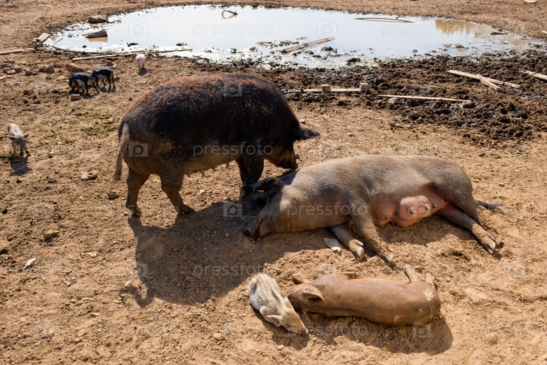 Мать-свинья со своими маленькими поросятами в загоне на ферме
