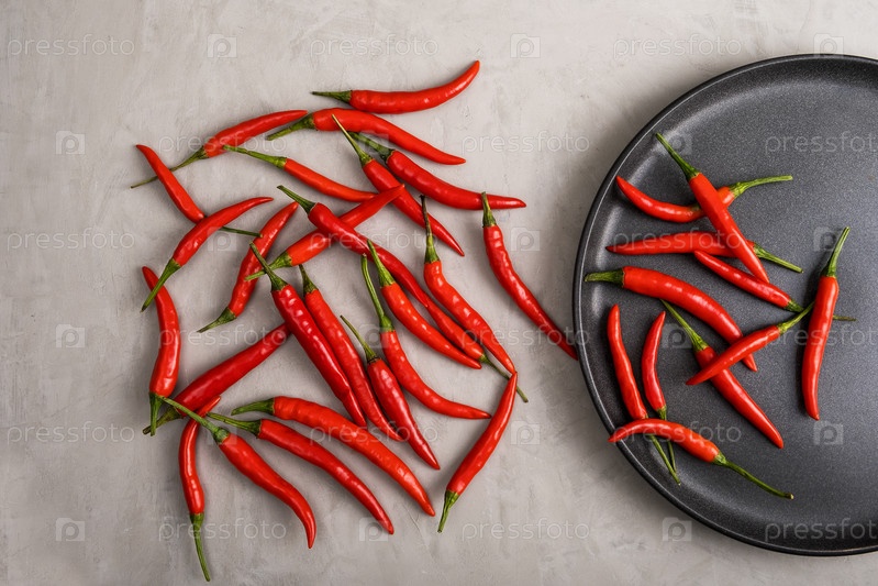 Весь красный острый перец чили в черной тарелке и рядом с ней