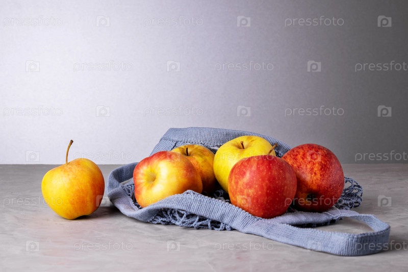 Свежие спелые красивые яблоки в экологичном сетчатом мешке