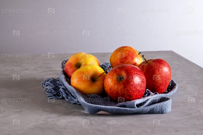 Свежие спелые красивые яблоки в экологичном сетчатом мешке