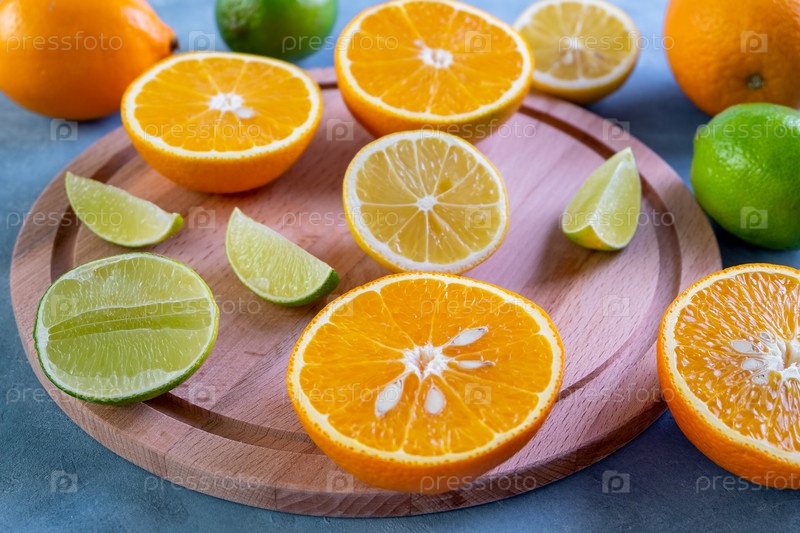 Спелые цитрусовые целые и нарезанные на круглой деревянной разделочной доске