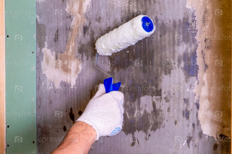 Обработка стены специальным раствором против грибка и плесени с помощью строительного валика