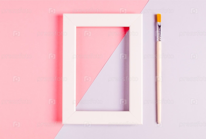 Макет белой пустой рамки на розово-сиреневом слое и кисти для декорирования и покраски