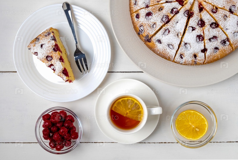 Вид сверху крупным планом нарезанного вишневого пирога, кусочка пирога на тарелке и чая с лимоном