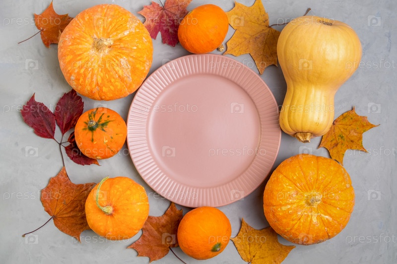 Пустая розовая тарелка в окружении спелых тыкв и осенних листьев