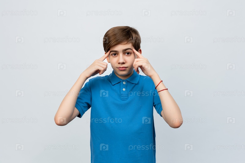 Задумчивый парень смотрит в камеру, показывает пальцами на голову, пытается решить сложную задачу или найти ответ у себя в голове. Мальчик подросток в синей футболке стоит на белом фоне