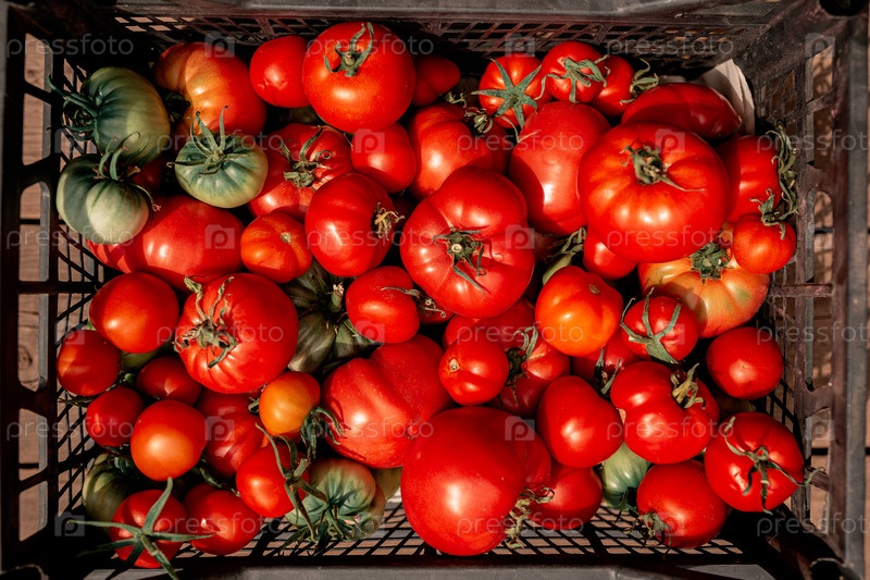 Много помидоров в коробке. Продаются красивые красные помидоры. Вид сверху. Абстрактные фоновые помидоры для дизайна и проекта