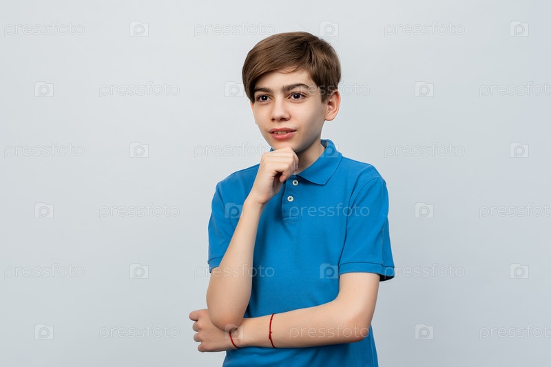 Задумчивый парень смотрит в сторону и о чем-то мечтает. Мальчик подросток в синей футболке стоит на белом фоне