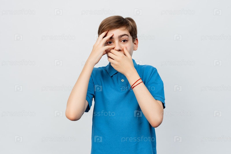 Портрет испуганного, шокированного мальчика 12-15 лет. Эмоциональный мальчик подросток в синей футболке стоит на белом фоне