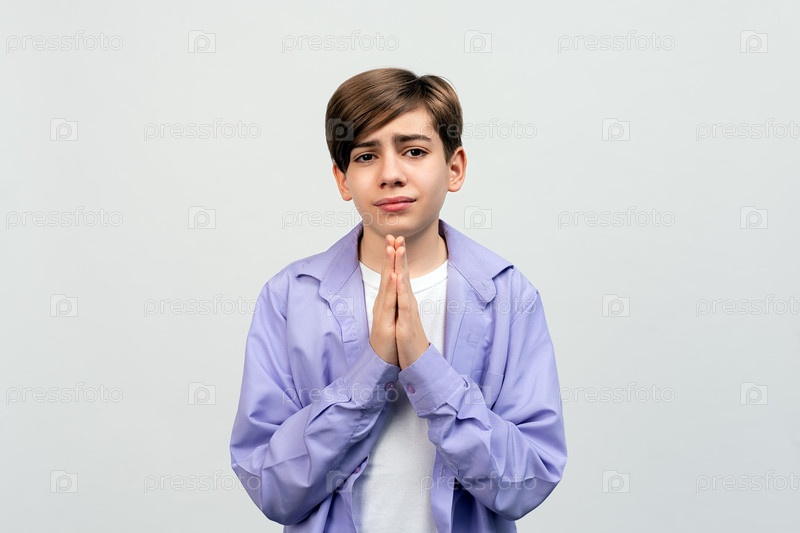 Милый молодой человек держит руки вместе в молитвенном жесте. Он просит прощение у родителей. Надеется что его желание испонится. Мальчик подросток в белой футболке и сиреневой рубашке стоит на белом фоне