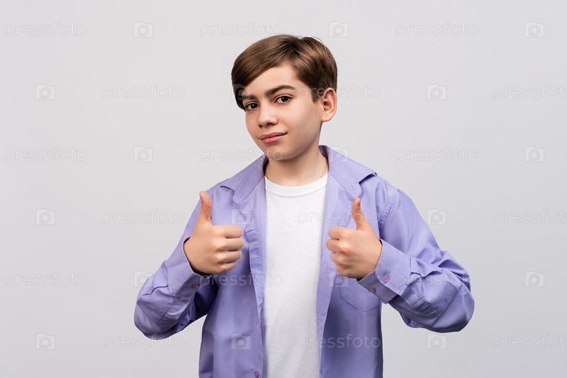 Красивый молодой парень показывает два больших пальца. Он чем-то доволен, согласен с вами. Мальчик подросток в белой футболке и сиреневой рубашке стоит на белом фоне