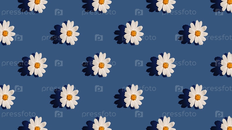 Абстрактный цветочный эстетический фон. Красочные цветочные бутоны ромашки на синем фоне. Шаблон красивых цветов. Бесшовный цветочный узор с белыми цветами, минимальный принт для открытки или оберточной бумаги