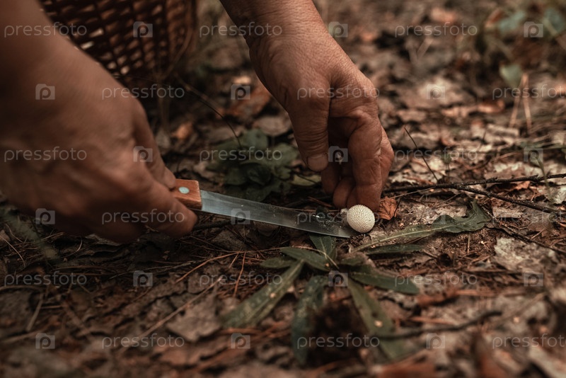 Грибник режет гриб ножом в зеленом мху. Сезонный сбор съедобных грибов в лесу. Руки мужчины, нож, грибы