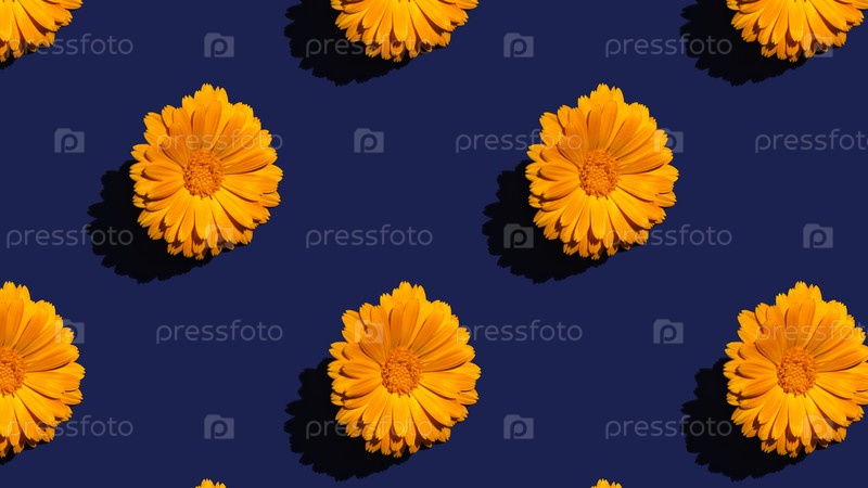 Абстрактный цветочный эстетический фон. Красочные цветочные бутоны на синем фоне. Шаблон красивых цветов. Бесшовный цветочный узор с оранжевыми цветами, минимальный принт для открытки или оберточной бумаги