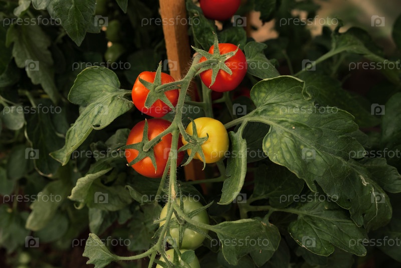 Зеленые и красные помидоры на ветке в теплице. Продукты питания, овощи, сельское хозяйство. Крупный план