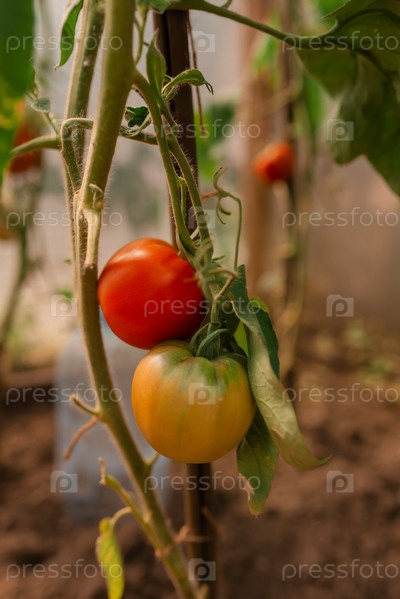 Зеленые и красные помидоры на ветке в теплице. Продукты питания, овощи, сельское хозяйство. Крупный план
